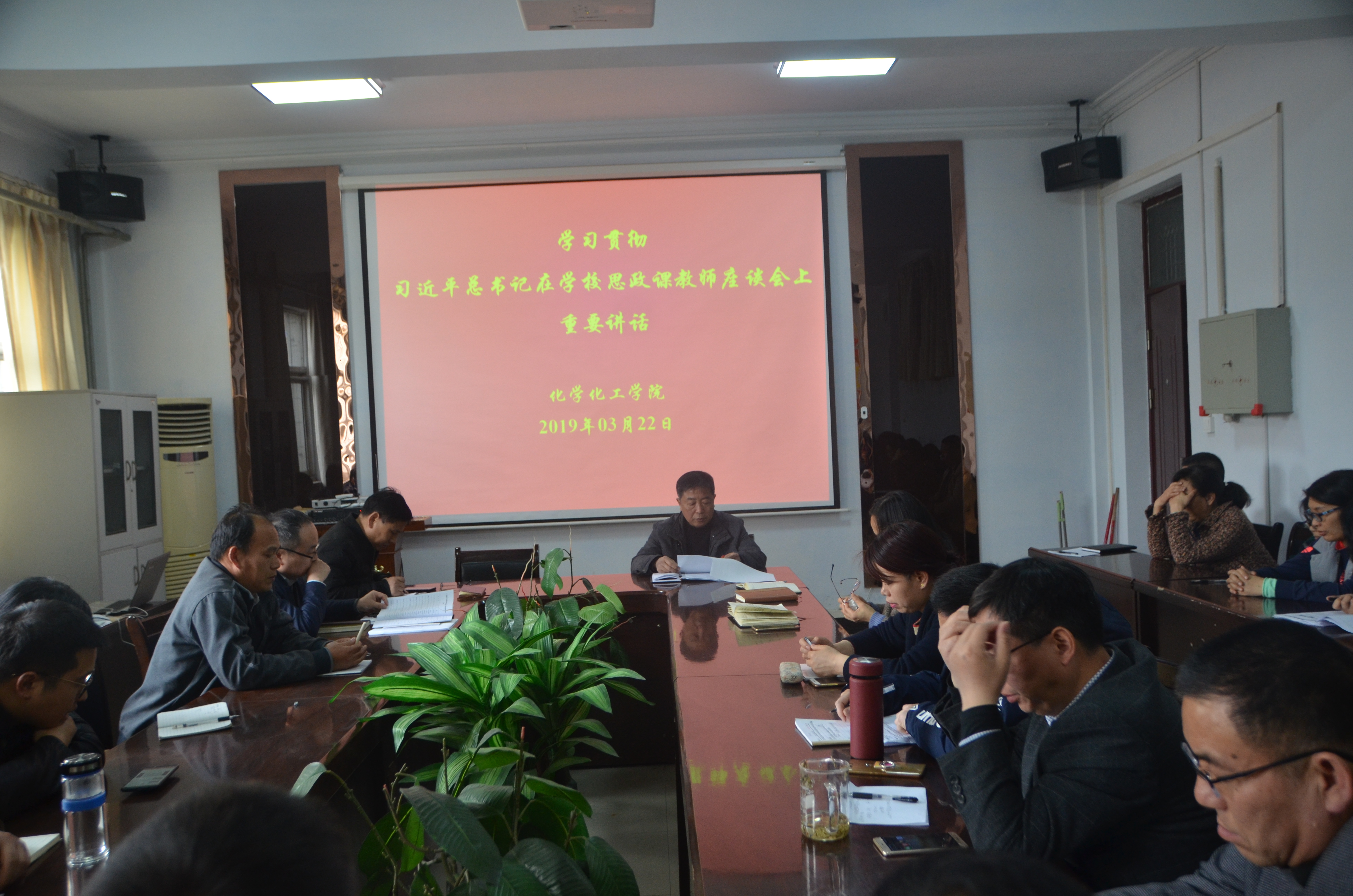 3月22日下午,英国威廉希尔公司全体教职工于睢阳校区7号楼会议室集中观看学习习近平总书记在学校思想政治理论课教师座谈会上的讲话。学习会由院党总支书记韩忠民主持。