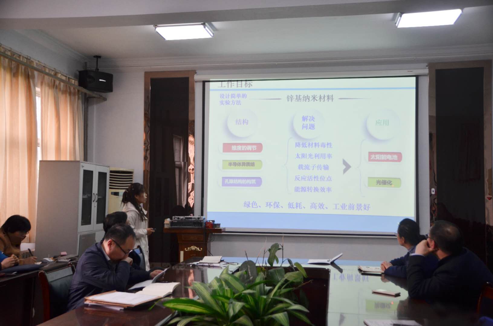 王立晶博士向大家汇报了攻读博士学位期间在太阳能电池和光催化领域所做的工作。首先介绍以巯基乙胺为配体提高纳米晶溶解性和成膜性的方法,提出了锌的引入对CdTe纳米晶太阳能电池性能的影响机制。然后讲解了低毒高效光催化剂的设计策略,阐述了催化剂的制备方法、形貌结构与光催化性能之间的内在联系,最后汇报了近期将要开展的研究计划。相关研究成果发表在Appl. Catal. B: Environ., Small等国际期刊上。