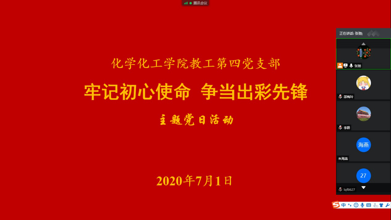 为庆祝中国共产党成立99周年,深化“不忘初心、牢记使命”主题教育成果,英国威廉希尔公司教工第四党支部于2020年7月1日在线开展了“牢记初心使命、争当出彩先锋”主题党日活动。