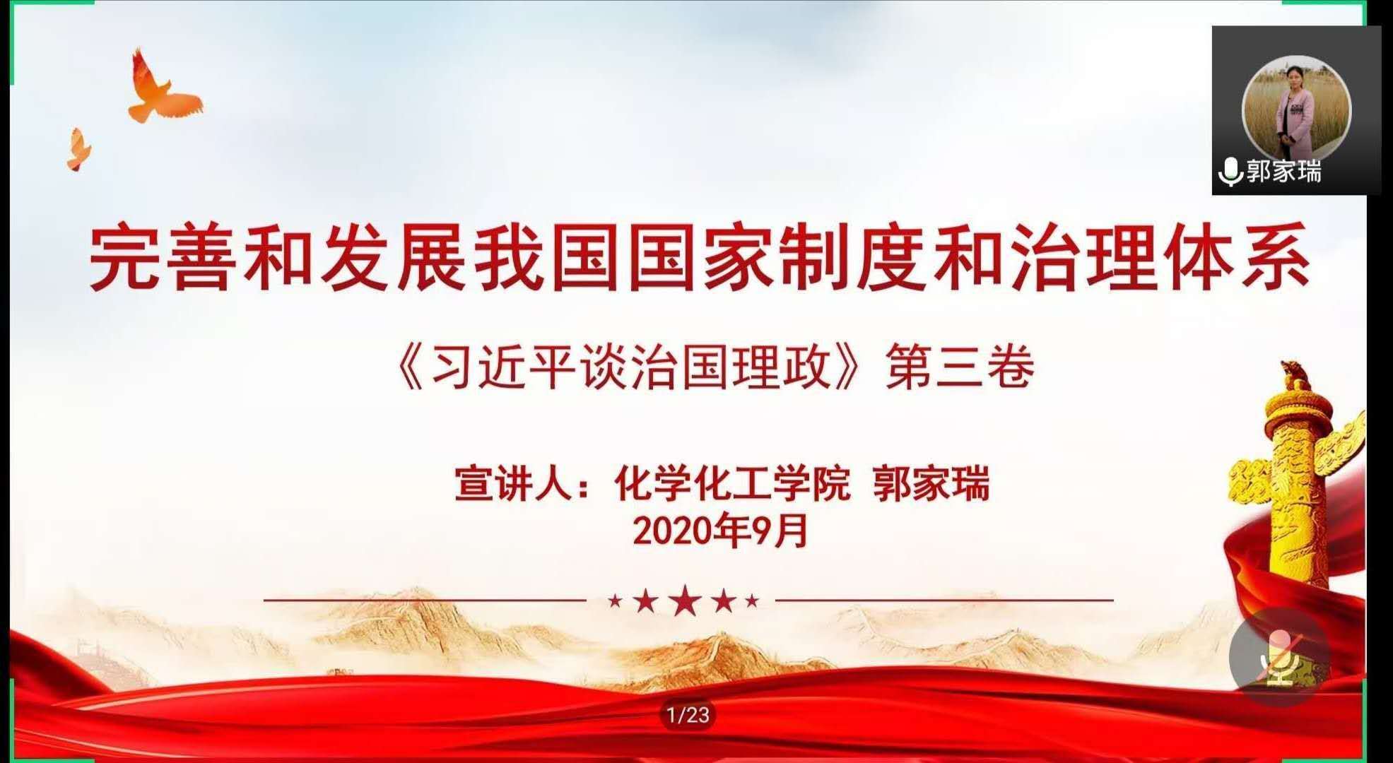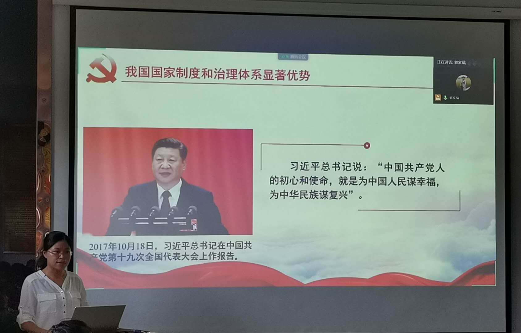 本次宣讲主要围绕《习近平谈治国理政》第三卷第三专题《完善和发展我国国家制度和治理体系》,从国家制度的显著优势及完善发展国家制度和治理体系的重大意义两个方面进行理论宣讲,通过详实的案例和数字,引导同学们去感受我国国家制度的显著优势。同学们认真听讲,积极发言讨论,达到了此次宣讲活动的预期效果。