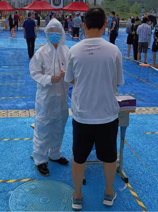 核酸检测当天,从早上六点的场地布置到九点左右的现场秩序维护再到下午两点的信息核实等整个检测期间,几乎没有休息的时间,但魏子栋同学没有抱怨没有喊累,直到协助医护人员顺利完成核酸采样等所有工作后他才休息。脱掉防护服后,衣服已全部湿透。