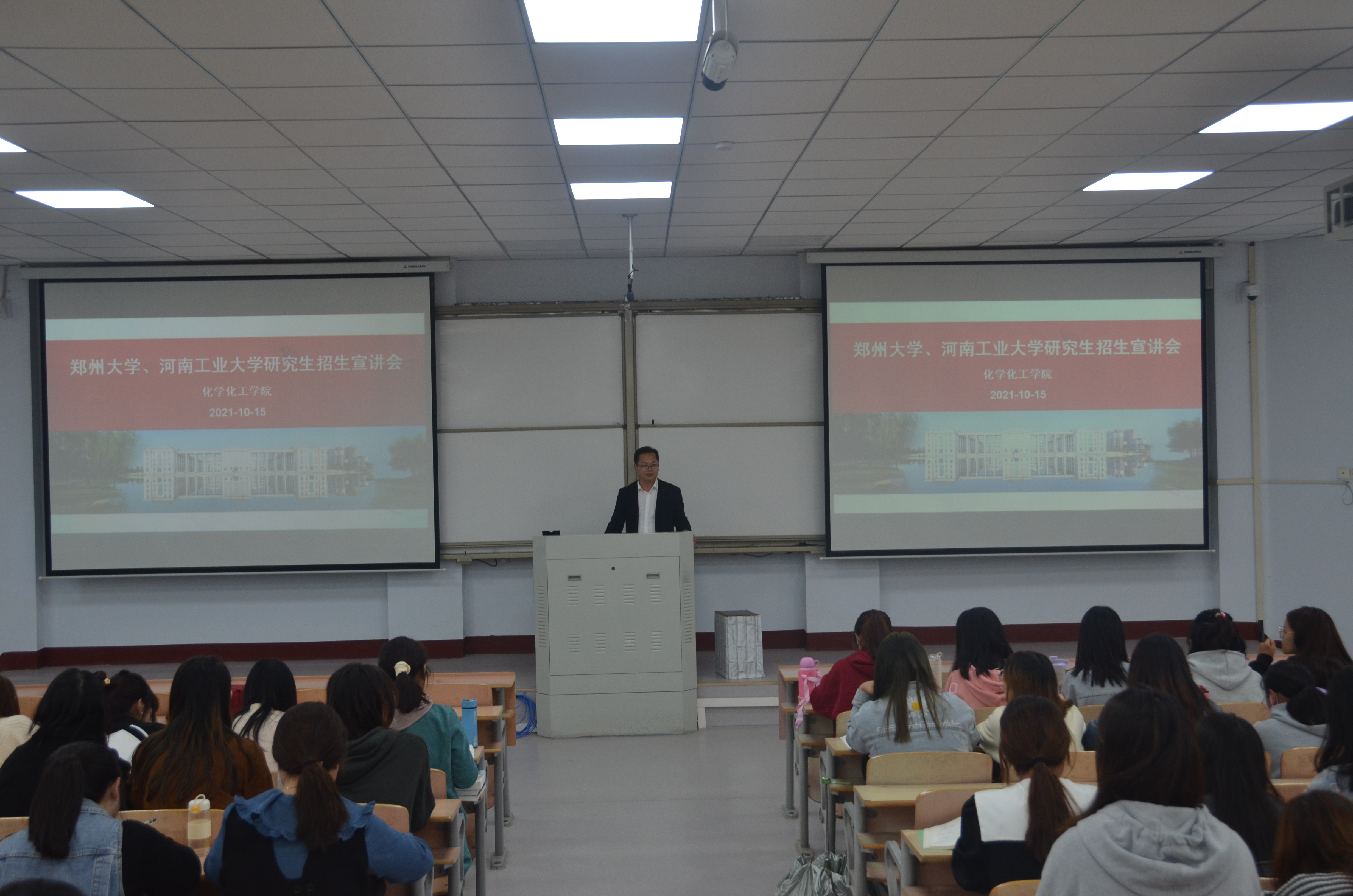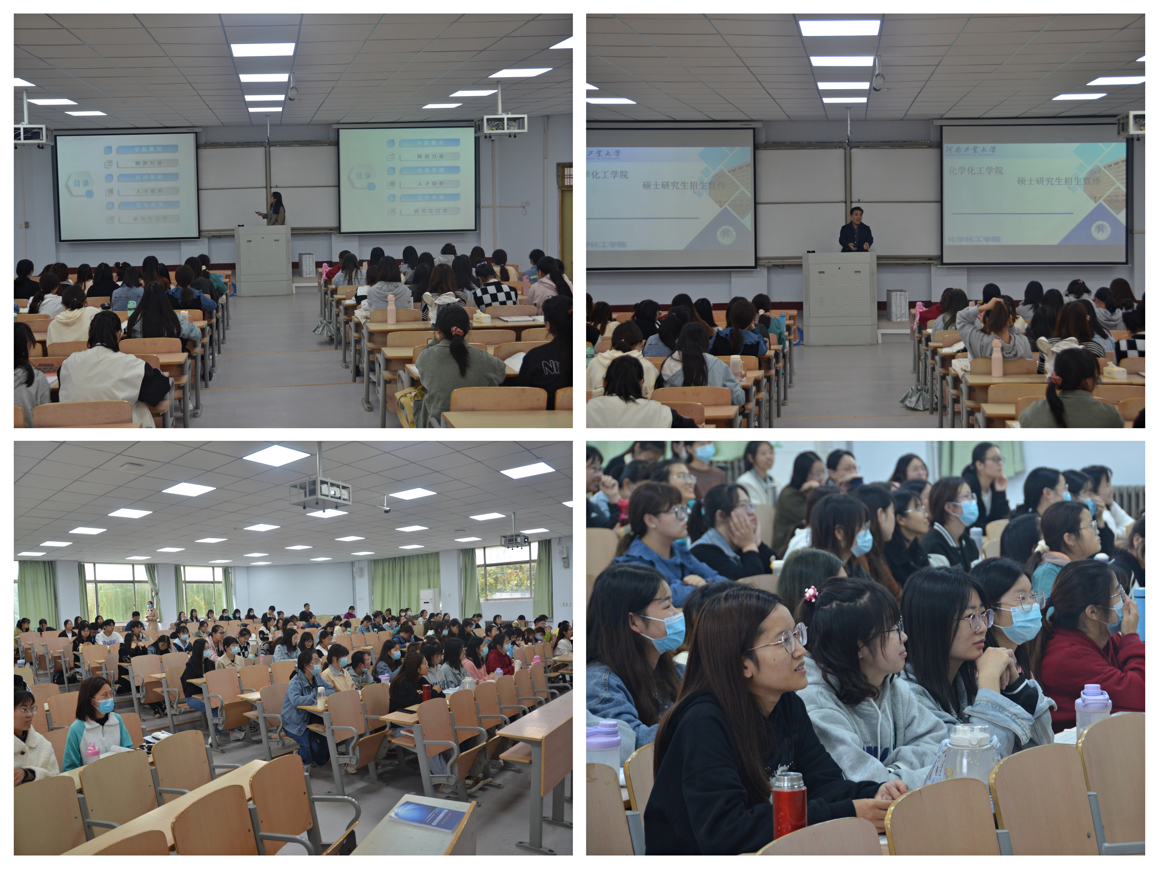 来自郑州大学的宣讲人王秋灵老师和来自河南工业大学的胡乐乾老师分别从学校概况、学院师资力量、科研机构、专业招生名额、招生政策、直博生硕博连读生管理办法以及奖助贷政策等方面进行了详细介绍。并希望我院考生合理定位,积极报考郑州大学和河南工业大学进行深造。