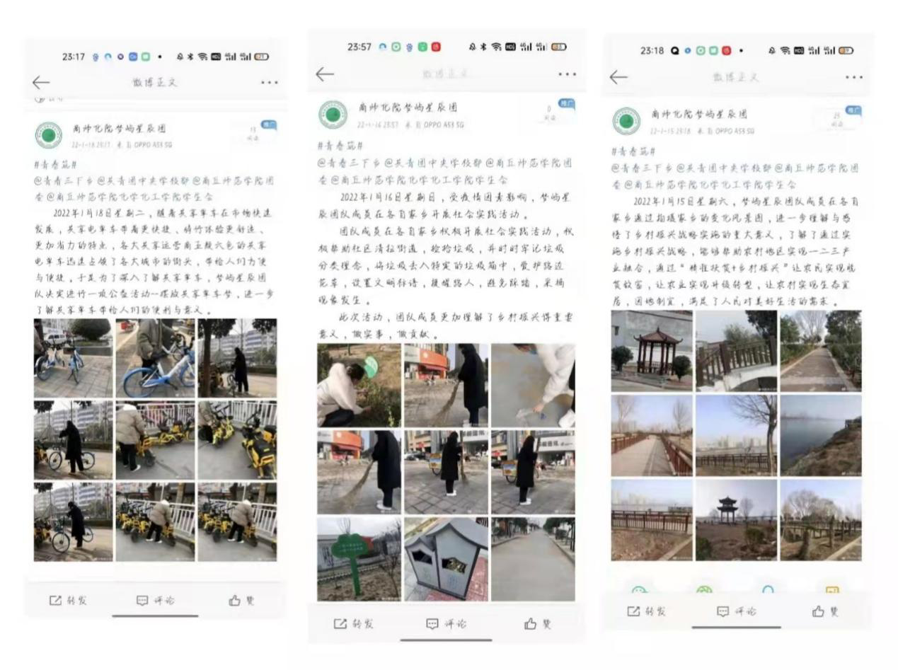 1月16日,梦屿星辰队成员在各自家乡积极开展社会实践活动,积极帮助社区清扫街道,捡拾垃圾,并时时牢记垃圾分类理念,将垃圾丢入特定的垃圾箱中,爱护路边花草,设置文明标语,提醒路人,避免踩踏,采摘现象发生。通过此次活动,梦屿星辰队成员更加理解了乡村振兴的重要意义。