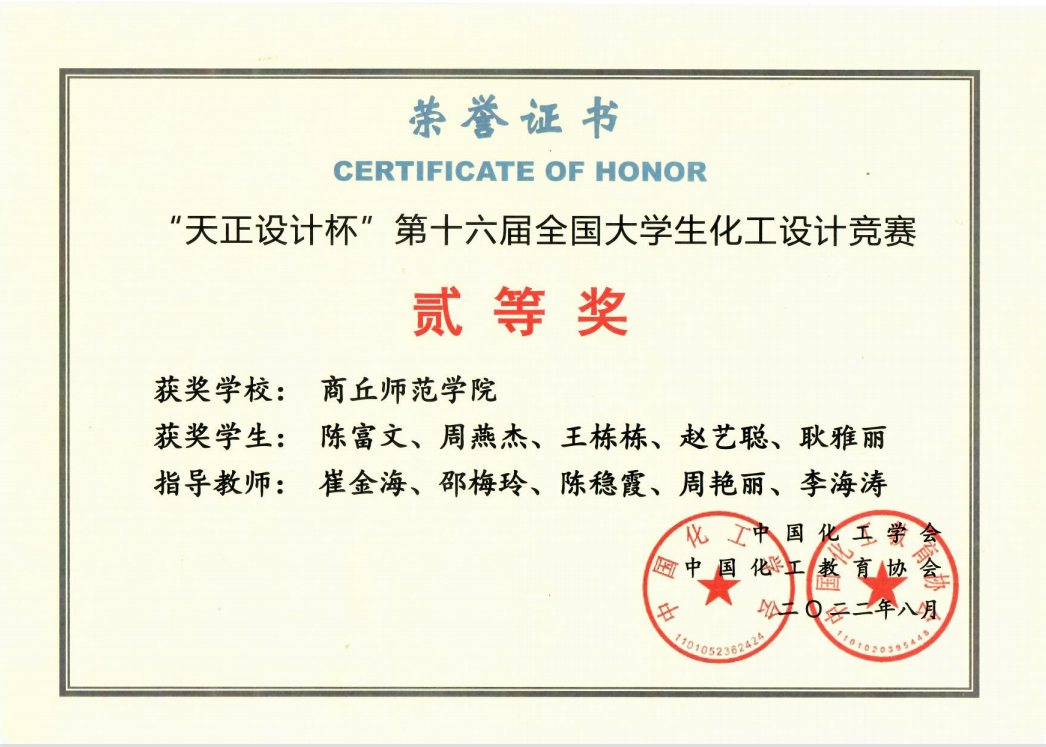 近日,由中国化工学会、中国化工教育协会举办的第十六届“天正设计杯”全国大学生化工设计竞赛在华东理工大学落下帷幕。我院学子陈富文、周燕杰、王栋栋、赵艺聪、耿雅丽组成的代表队在崔金海、邵梅玲等老师的指导下,经过半年多时间的努力,在作品设计和答辩中脱颖而出,荣获全国二等奖。