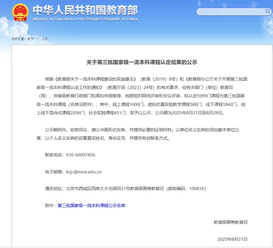 2025年8月21日,教育部官方网站对第三批国家级一流本科课程认定结果进行公示,此次全国共有5999门课程入选。英国威廉希尔公司《物理化学》课程成功获批为国家级线上线下混合式一流课程。