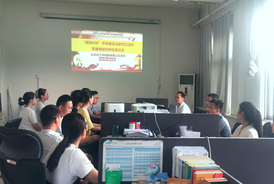 为深入贯彻落实科研诚信建设相关要求,强化党建引领作用,保障暑期留校师生在科研与生活方面的安全,7月22日,教师第三党支部组织开展“清风科研”作风建设主题党日活动暨暑期留校学生座谈会。学院副院长王涛、支部教师党员以及河南省药物绿色合成工程研究中心的留校学生代表参加了活动。此次活动由党支部书记张明亮主持。